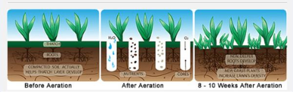 One key aspect to a healthy lawn that is often overlooked is aerating. Core aeration is important because it removes compacted soil and thatch buildup. It allows air, water, and nutrients to penetrate surface soils and reach the root systems where these three items are needed most to promote deeper root growth. It also reduces water runoff. Core aeration is often referred to as “plug aeration” in which, by mechanical means, a plug of soil about 3” in length is removed from the turf.